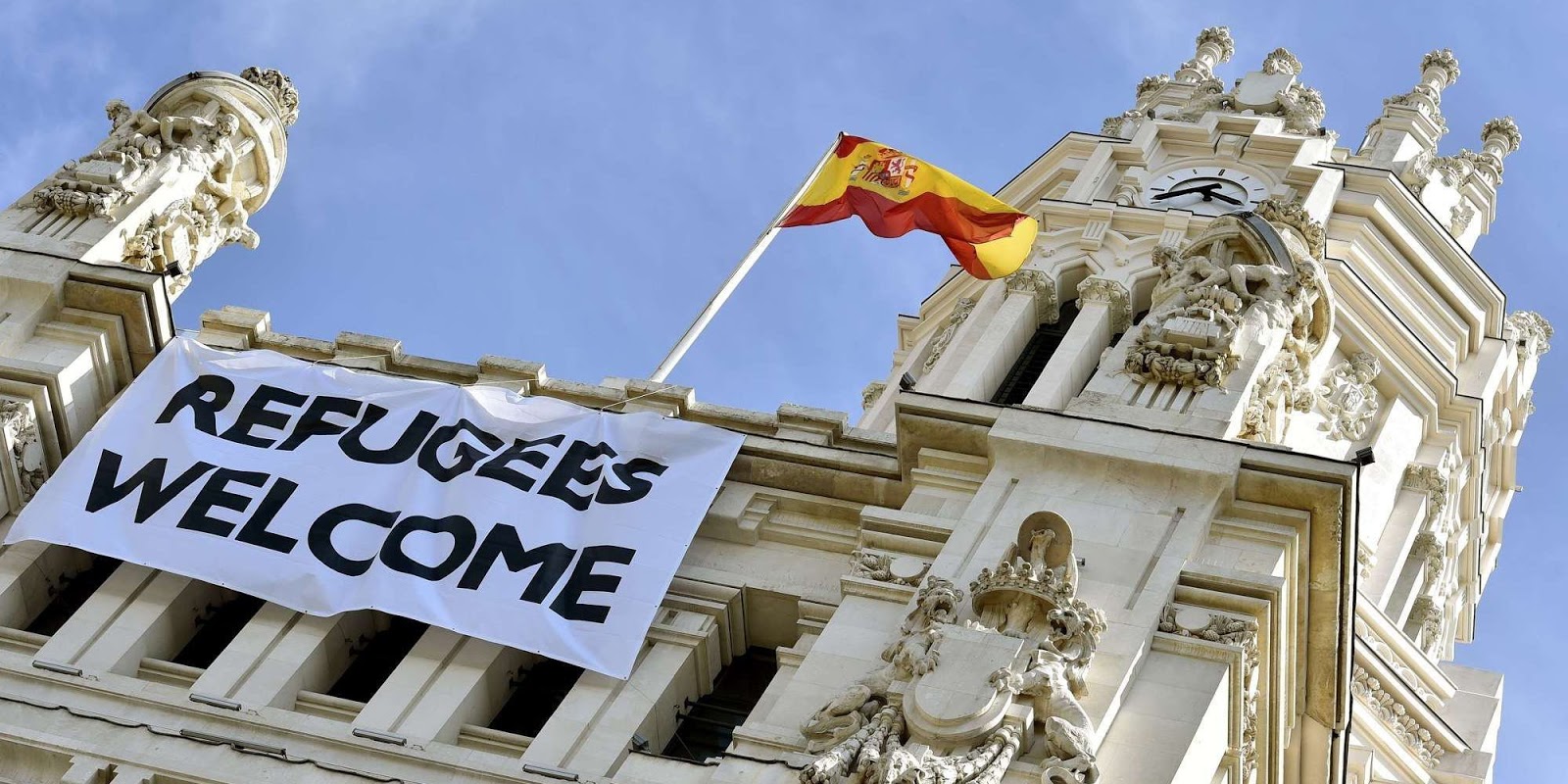 | Durante la crisis de los refugiados de 2015, la alcaldía de Madrid descolgó en el Palacio de Cibeles una pancarta dando la bienvenida a los refugiados. Fuente: Cristina Martín, www.madridiario.es |